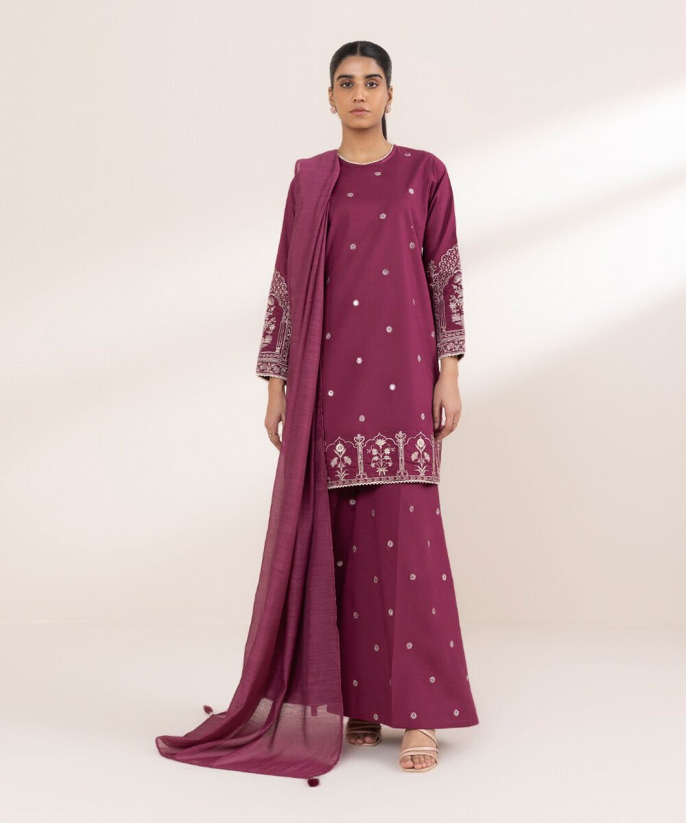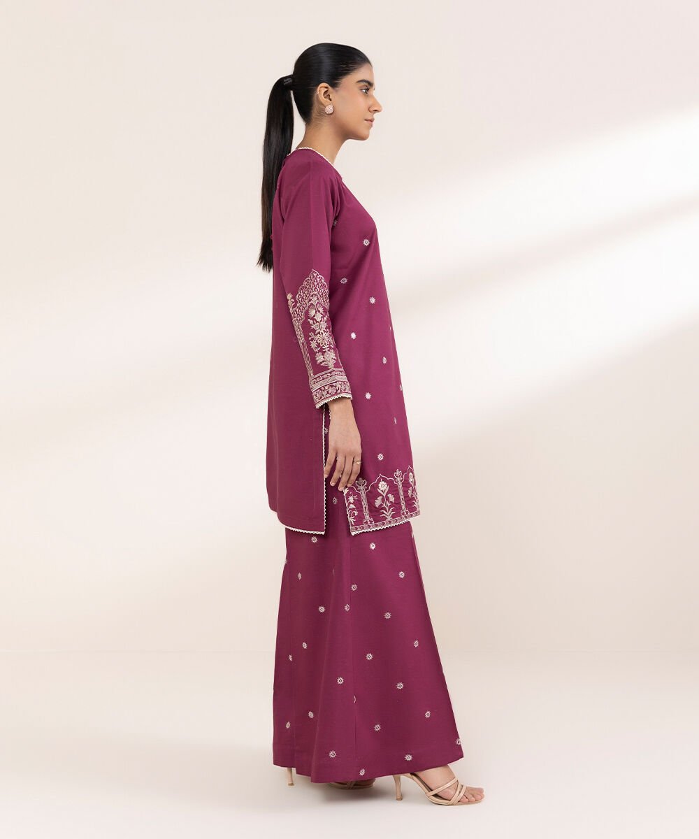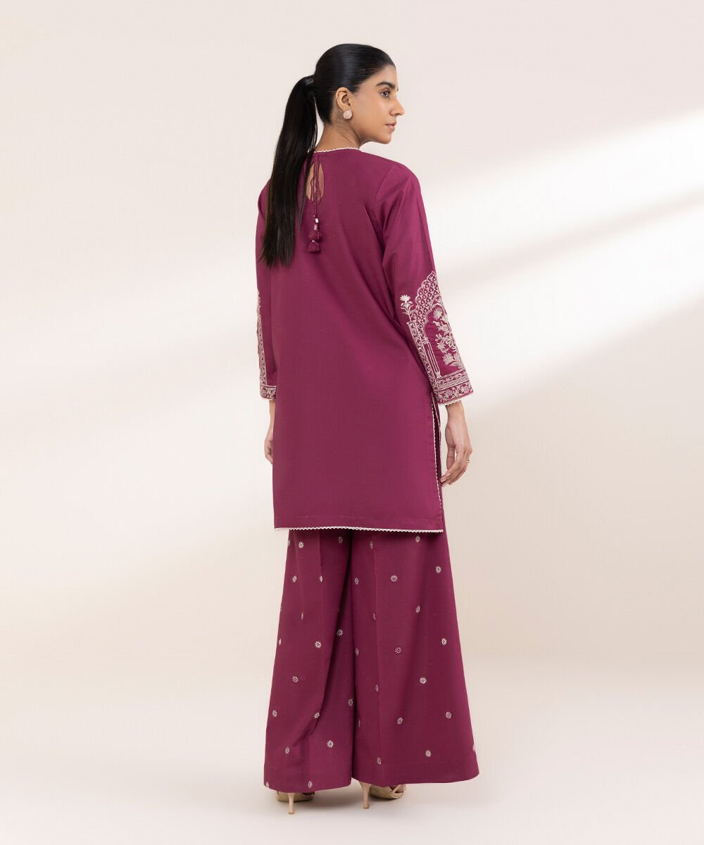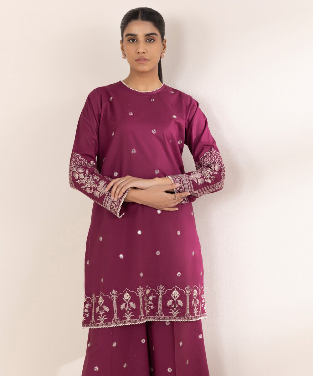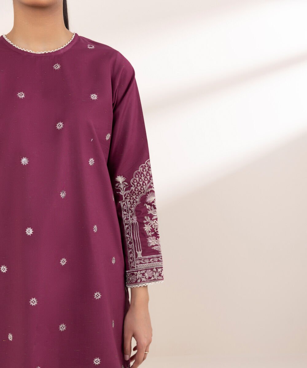 Upgrade your wardrobe in our embroidered purple cross hatch Aline shirt featuring a round neckline.