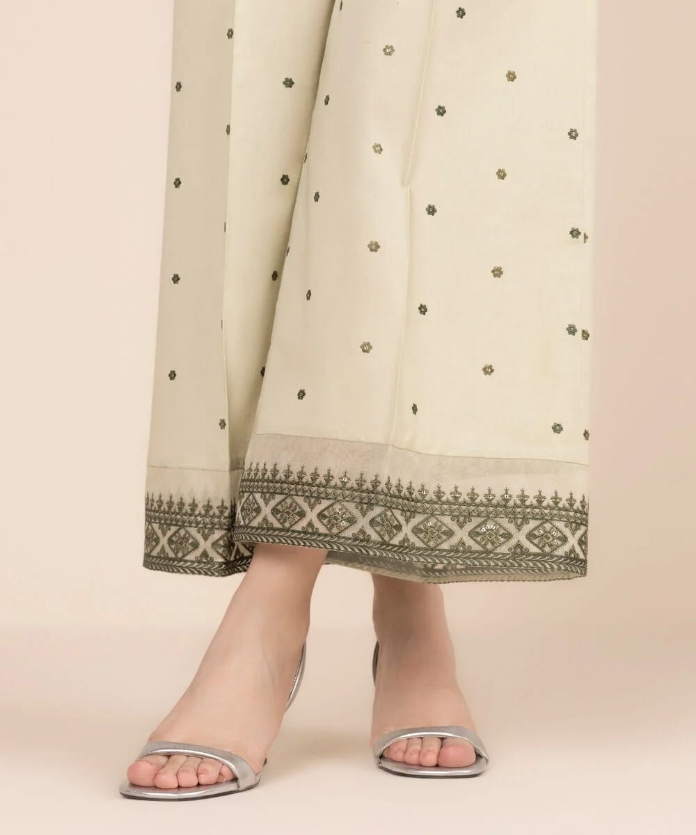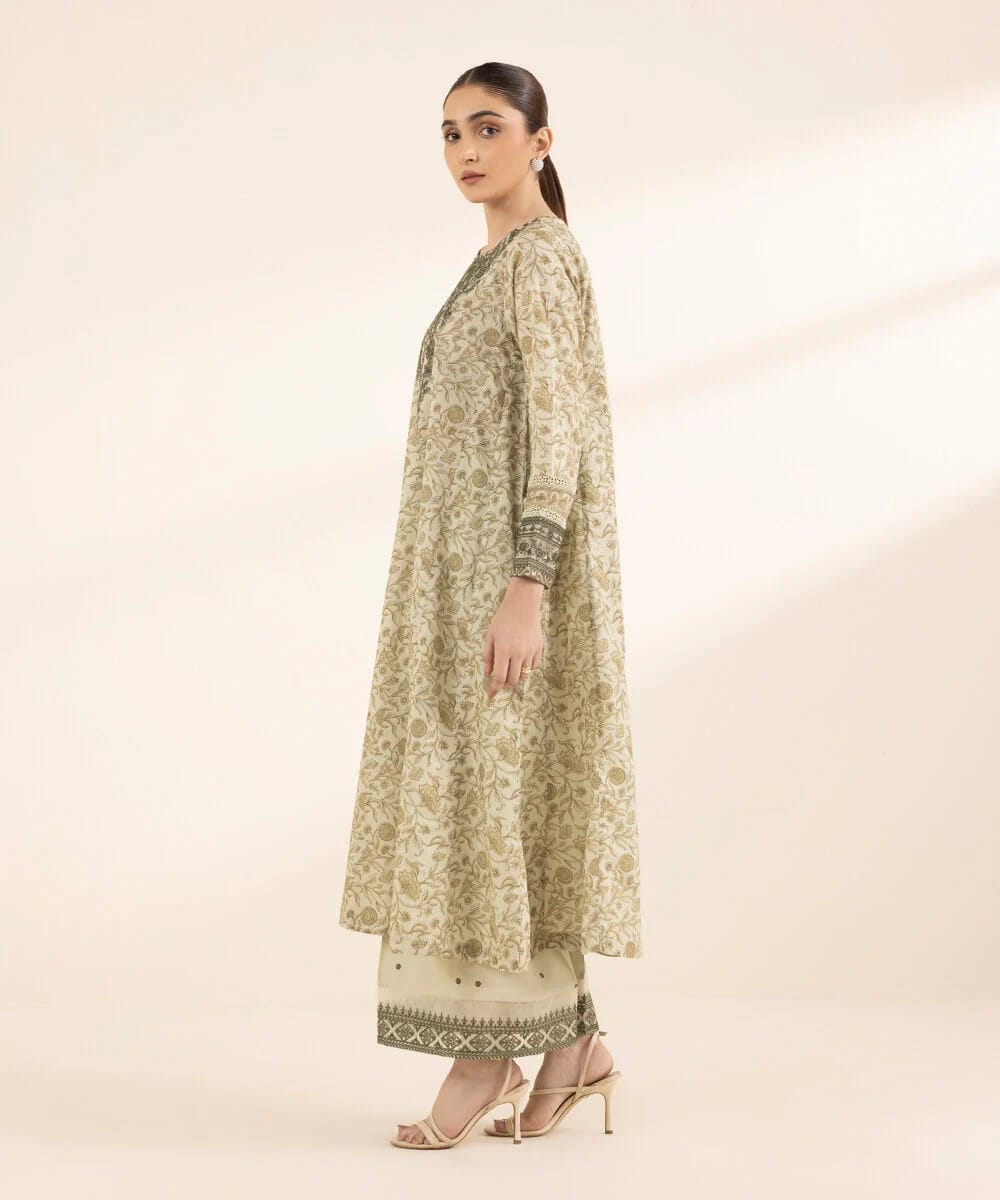 Printed With Embroidered And Sequins Front Panel, Printed Back Panel, Round Neckline, Full Sleeves, Long Length Colour: Green Fabric: Lawn